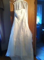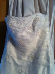 Beuatifully Embroidered Organza Bridal Gown with 3D Floral Effects with Detailing over entire Gown. I love this Dress! But we changed our mind after we purchased this dress! Yes, its BRAND NEW, AND NEVER Worn! Still has the tags, and comes with the Garment Bag! This dress is Strapless, and has a draped Bodice and A line skirt that creates a slimming effect. This dress has ONLY been out of the garment bag twice, and is listed at the Davids Bridal store for $699.00. (see picture with the price tag attached to dress). Comes complete with the Davids Bridal Store garment bag.