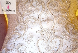 Ivory Stephen Yearick Couture wedding gown. Worn once for my own wedding. Purchased at Stephen Yearick Trunk Show at Kleinfeld in Brooklyn. Looks like Belle's gold ball gown in Beauty and the Beast. Hand beaded bodice, includes swarovski crystals, with skirt made of individual "petals". Chapel length train with bustle. All alterations done by Kleinfeld talented staff. Size - Altered 14. Off the shoulder straps were altered by having elastic and snaps attached for ease of arm movement. No need for full slip, skirt is full enough by itself.