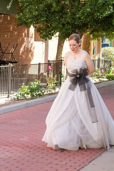 This is the gray version of a 2013 Vera Wang dress from her White Collection. I purchased this dress from Davids Bridal in the end of 2013. It was worn once in Oct of 2014. I have had it cleaned/ preserved through Davids Bridal. It comes with the black netting bow (as seen in pics 1-3). When I bought this dress it was a size 14. By October it had been taken in 1-2in in the bodice so it may be between sizes 12-14 (estimated). It has an over bustle buttons discretely sewn in (refer to pic 3)