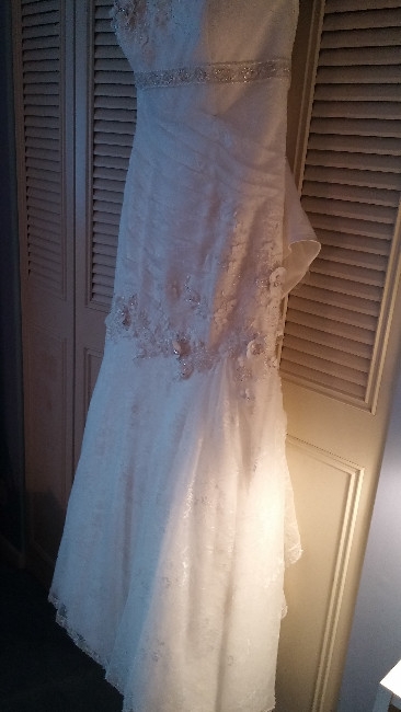 This Oleg Cassini dress has never been worn beyond one quick try on I did after it shipped to me. It is absolutely gorgeous, covered in delicate, form-fitting lace. Shortly after receiving it, however, I fell utterly in love with another dress that I wore in my wedding, so this beauty has been hanging up in my closet ever since. It's mermaid design creates lovely curves and the bead-work is beautiful.