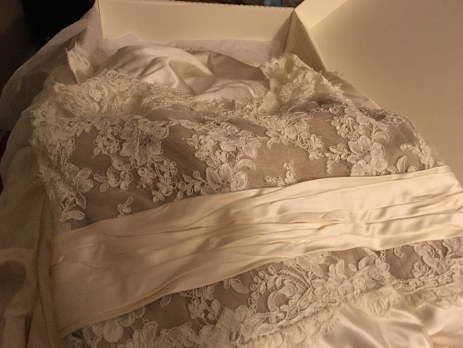 Lace overlay. Taupe/nude underneath bodice and ribbon waist band. A-line with built in crinoline. Size 12-14, tailored for 5foot tall. Lace trim matches bodice.