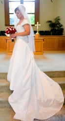 This white wedding gown is very stunning. As you can see by the pictures it has a corset style ties on the back of the dress. This dress will fit size 6 to size 10. It adjust in the back. This dress has been cleaned and preserved. It is in NEW condition. There is a full like slip for under the dress, that is included . Please look at the photos, the pictures show it all. If any questions please feel free to email me with your questions, will do my best to answer them. This dress sold for $1500. dollars back in 2008.